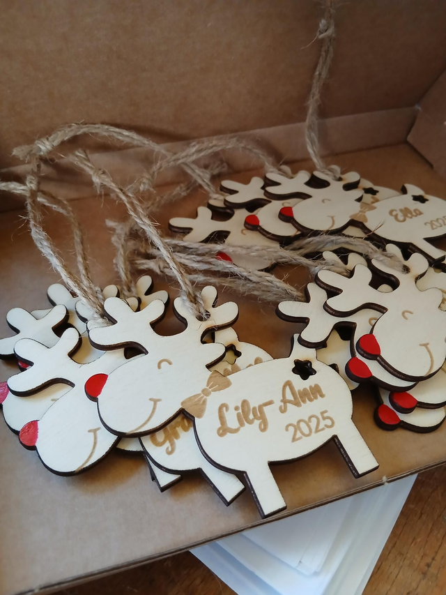 Reindeer decoration, made from sustainably sourced 3mm plywood. Designed, engraved and cut in Staffordshire. Posted out by 2nd class Royal Mail.